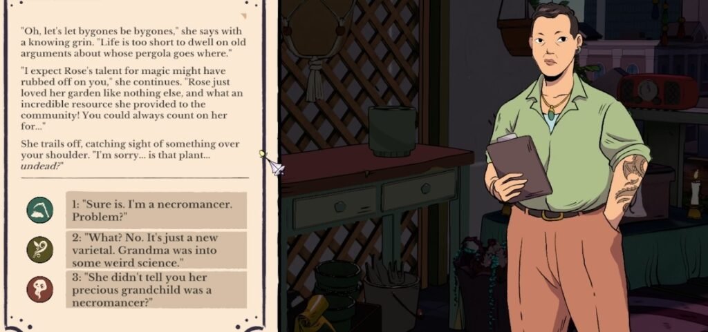 I appreciate that interactions with characters are expressly, not about gaining or losing friendship with them. You can react poorly to George’s kinda bigoted gut reactions to your necromancy then throw her a bit of a mental curve ball by reacting positively when she offers you a dead plant soon after. The writing in the character interactions feels so natural in the way it acknowledges that to err is human. We don’t shun our friends or even our neighbors because they put their foot in their mouth sometimes.