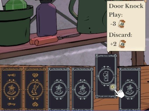 I compared it to Cultist Simulator earlier and this is where that really manifests. Where Cultist Sim feels more like keeping a series of saw blades spinning; knowing full-well dropping one will probably kill you, Greenhearth is more akin to a dining table covered in lazy-susans. The most you risk for over or under spinning one is time. Like, if you’re too focused on reviving plants and burn all your social battery, and you only have a few “knock” cards, you’re gonna be waiting around for a bit till the invisible cooldown flips and you draw something new that might give you some social battery.